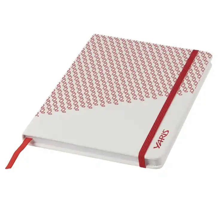 A5-ös méretű piros-fehér Toyota Yaris díszítéssel és lekerekített sarokkal ellátott jegyzetfüzet.
