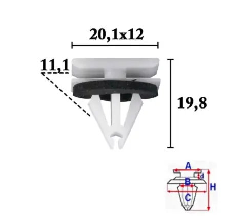 Méretek: A 19,8×12,1 mm, B 11,1 mm, C 20,1×12 mm, d 2,9 mm, H 19,8 mm