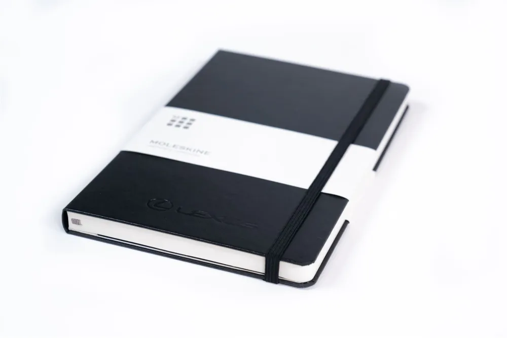 Stílusos vonalas jegyzetfüzet fekete színben, dombornyomott Lexus logóval és a Moleskine történetével.
