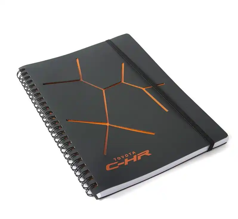 A5-ös méretű, narancssárga-fekete Toyota C-HR díszítéssel ellátott újrahasznosított bőrből készült jegyzetfüzet.