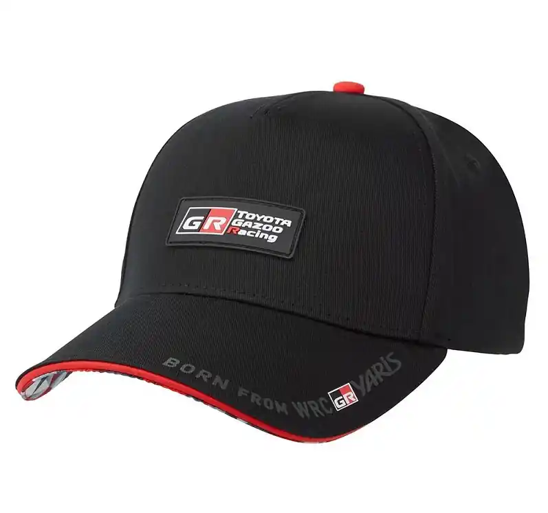Igazán sportos megjelenést biztosít ez a fekete Toyota Gazoo Racing Yaris feliratú baseball sapka. Alján GR terepminta díszítés és a szélén piros szegély dobja fel, a felső részén „Born from WRC” felirattal.