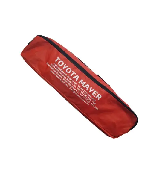Praktikus felszerelési tartozék táska, melyben helyet kap 1 db elakadásjelző háromszög, 1db láthatósági mellény és egy elsősegély csomag. Toyota Mayer feliratú.